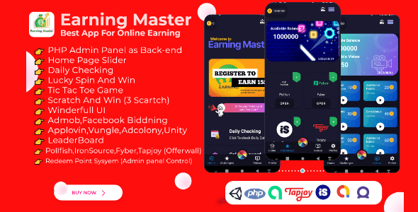 Earning Master Android Earn Money Rewards App With PHP Admin Panel, Admob, Facebook, Applovin, Unity, Start.io, Adcolony, Fyber, Vungle, IronSource, Tapjoy, Pollfish