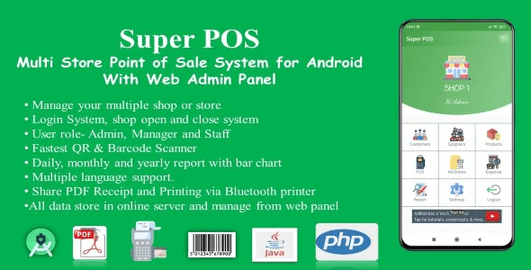 Super POS is an online based multi store point of sale system for Android devices with Web Admin panel to manage multiple store or shop. It is a very useful multi store online point of sale system for android mobile device or tablet. By using Super POS, you can easily maintain your all shops and all kinds of products and sales records. You can store customer and supplier’s information. You can easily see your daily, weekly, monthly and yearly reports with bar chart. Super POS has multiple language (English, Spanish, Bangla, French,Hindi) facility. You can sales product from Android device or tablet and manage pos system from web admin panel. All data store in online server. There are three types of user- Admin, Manager and Staff. Also have user access limitation. You can manage your shops sells smartly from anytime anywhere.