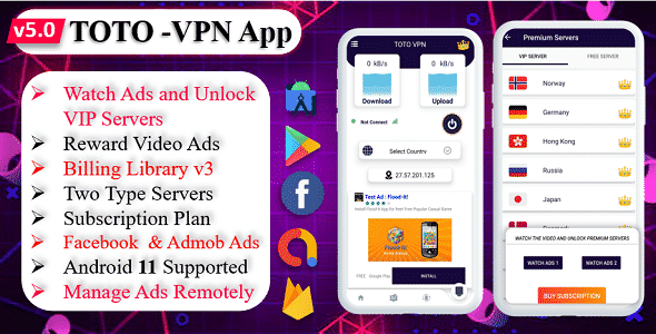 TOTO – VPN app ( Created By Indra Tech ) with ( VPN with Phone Booster, VPN with CPU Cooler, VPN with Battery Saver ) is very fast and secure VPN app with unlimited bandwidth and lot of secure servers in this VPN app when you click on select option you can see VPN server lists. In this VPN app you can connect any country server on only one click. when you connect with any server you can see time in this VPN app. Now you can easily unblock those ego-restricted websites and gain access. In this VPN app You can easly monitor user list through third party website. Admob ads is already integrated ads in this VPN app for generate Revenue. And You can Generate Revenue through Subscription Plan. In this VPN app have New Subscription Plan Design Comfortable with Google Play Console Policy.